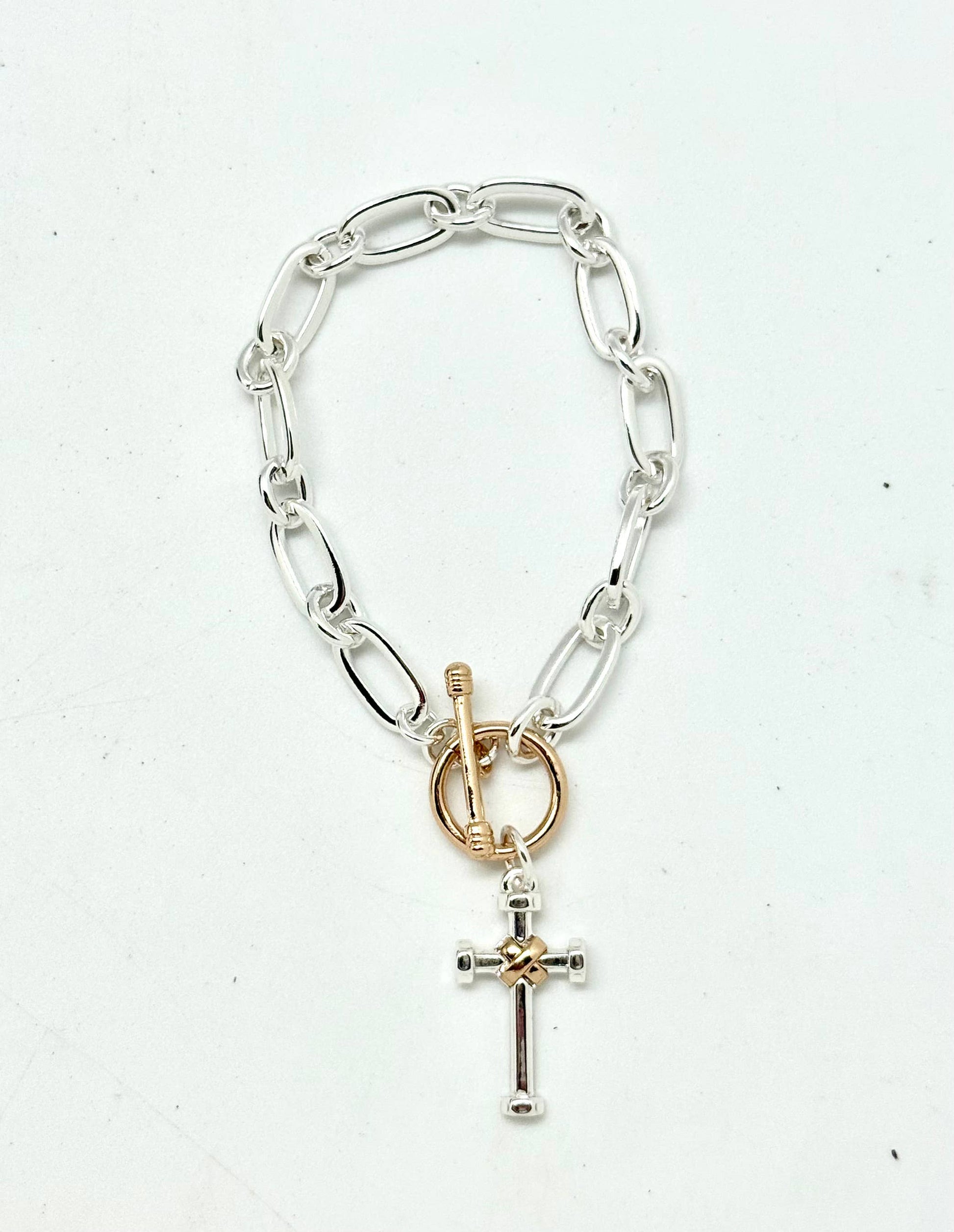 Bracelet Alloy Plated Silver Chain with Gold Toggle and Multi Metal Cross 7”