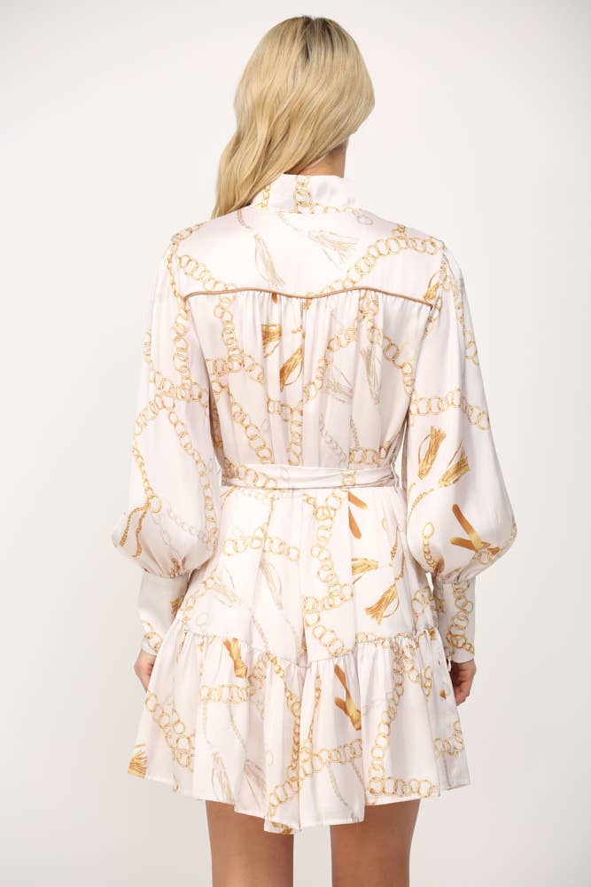 CHAIN PRINT SATIN STAND COLLAR TIE WAIST DRESS FD30321