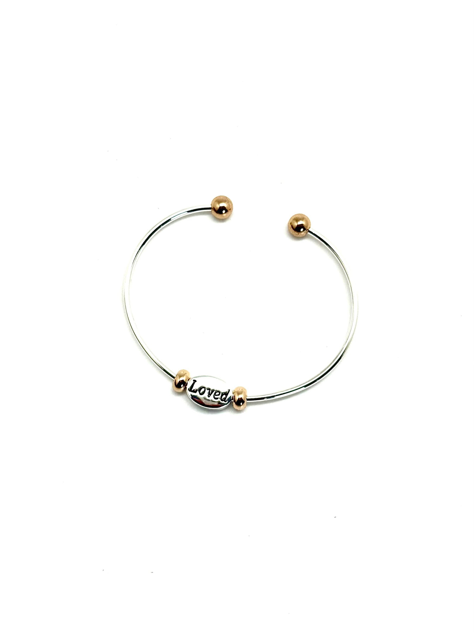 This adjustable cuff bracelet features high-quality silver plating with elegant gold tips, creating a striking two-tone look. At the center sits a delicate medallion engraved with the word LOVE, adding a meaningful and timeless touch. Perfect for everyday wear or as a thoughtful gift