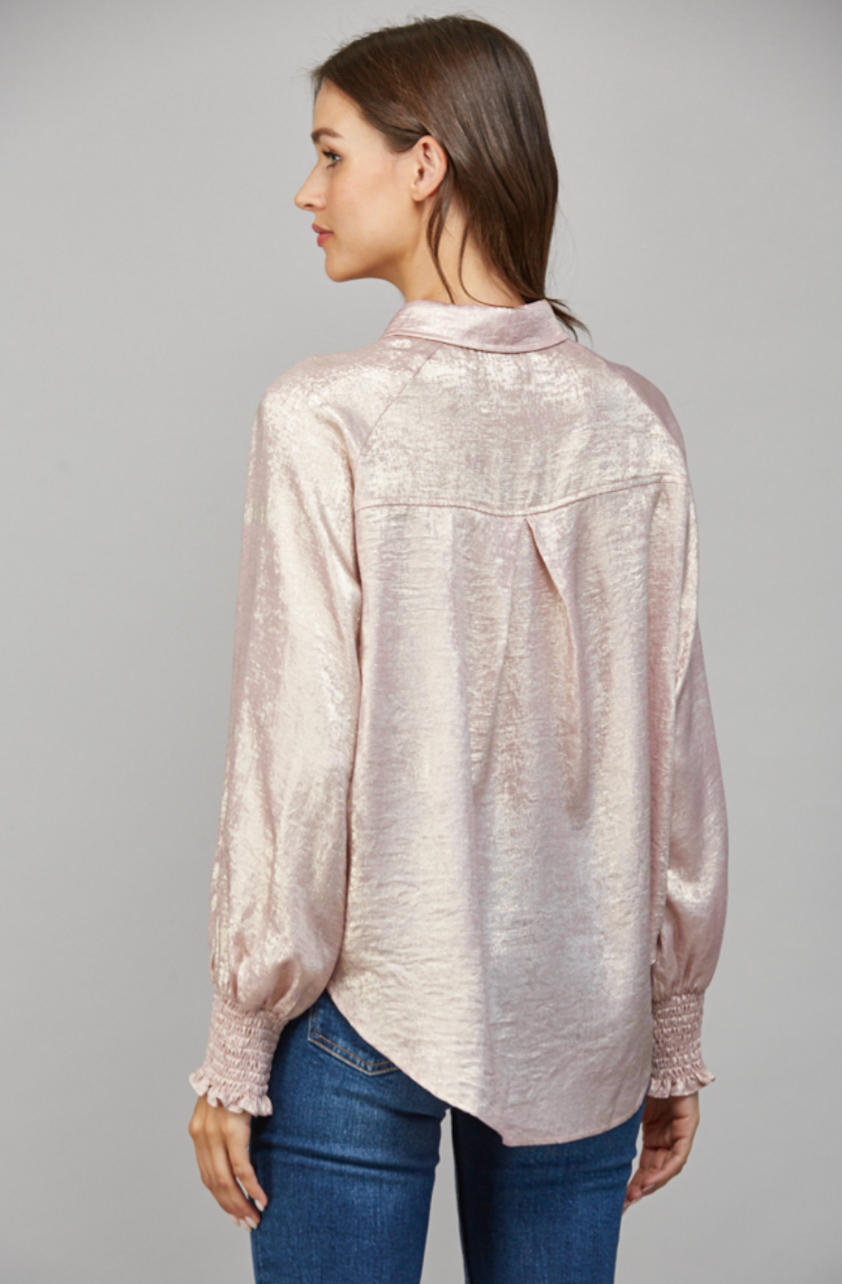 Long Sleeve Button Up Blouse with Smocking Cuffs