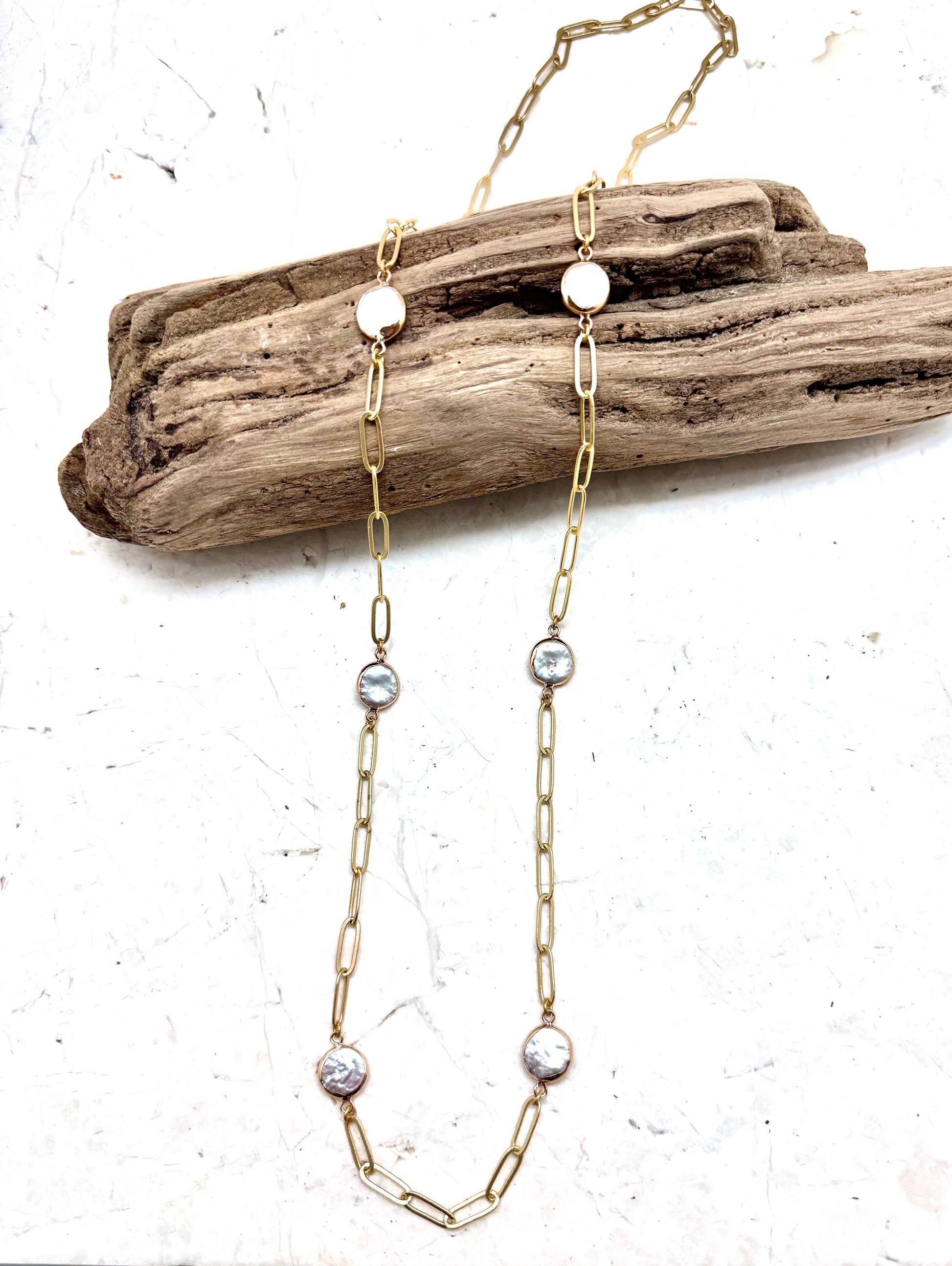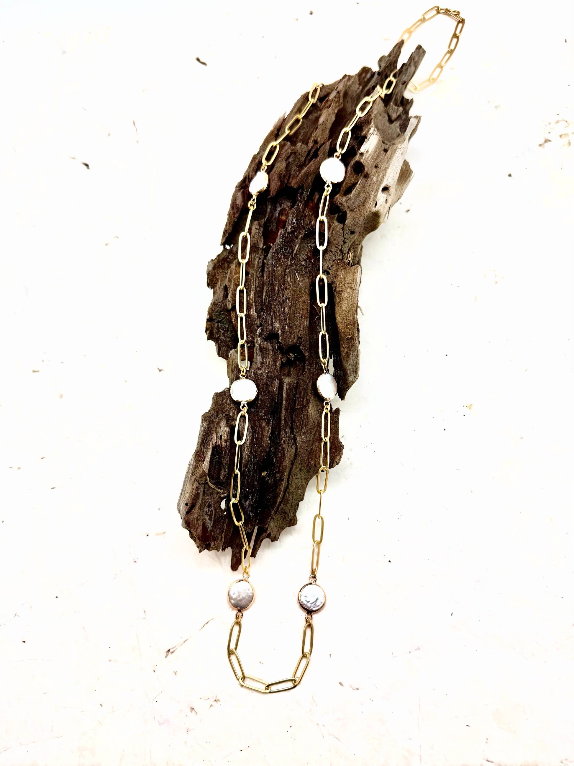 Necklace 6 Coin Pearl with Gold Trim on Matte Alloy Plated Chain 32”