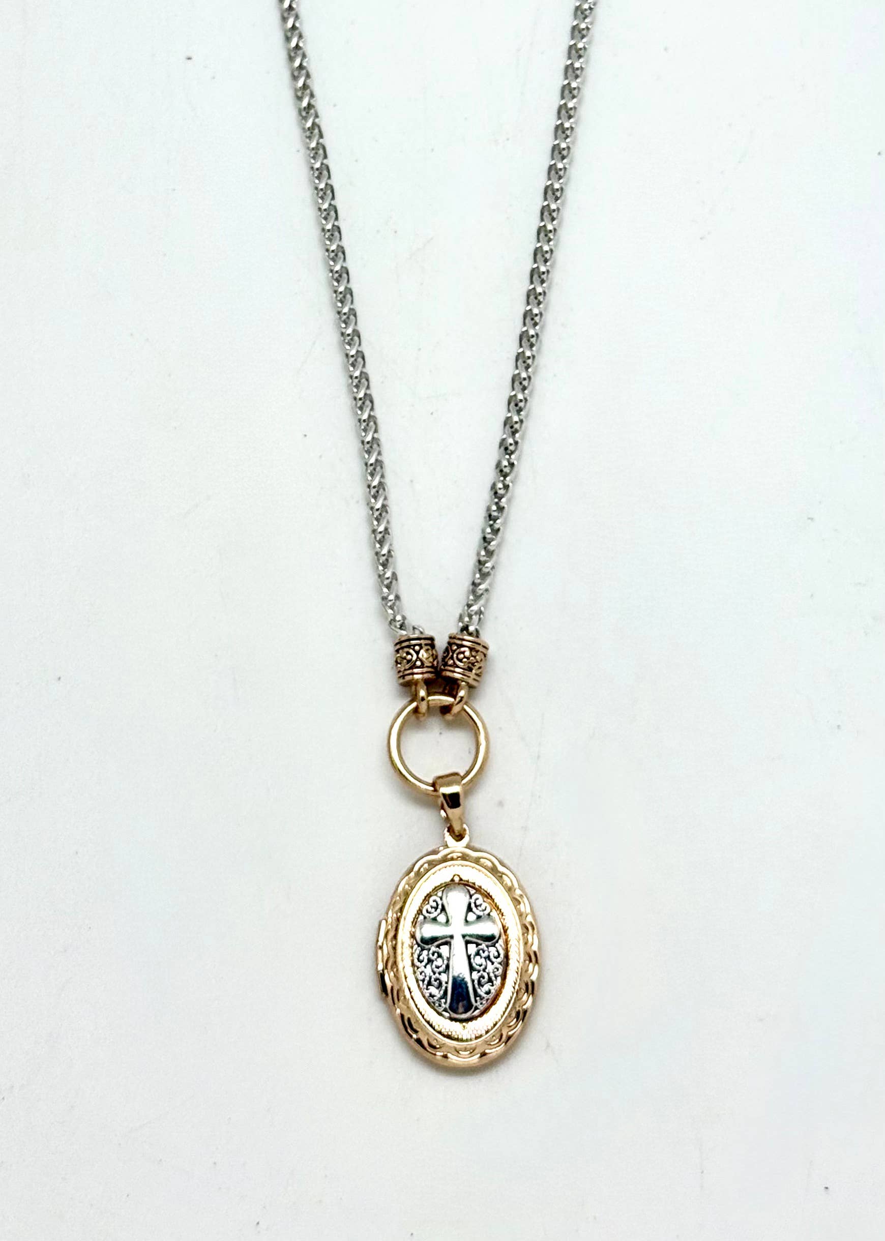 Necklace AlloyPlated SilverChain w/Gold Cross Locket 18”w/2”