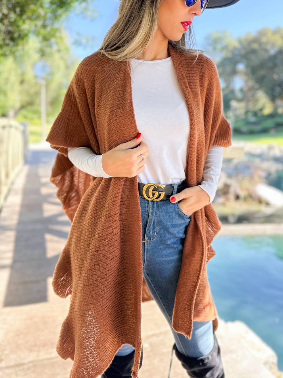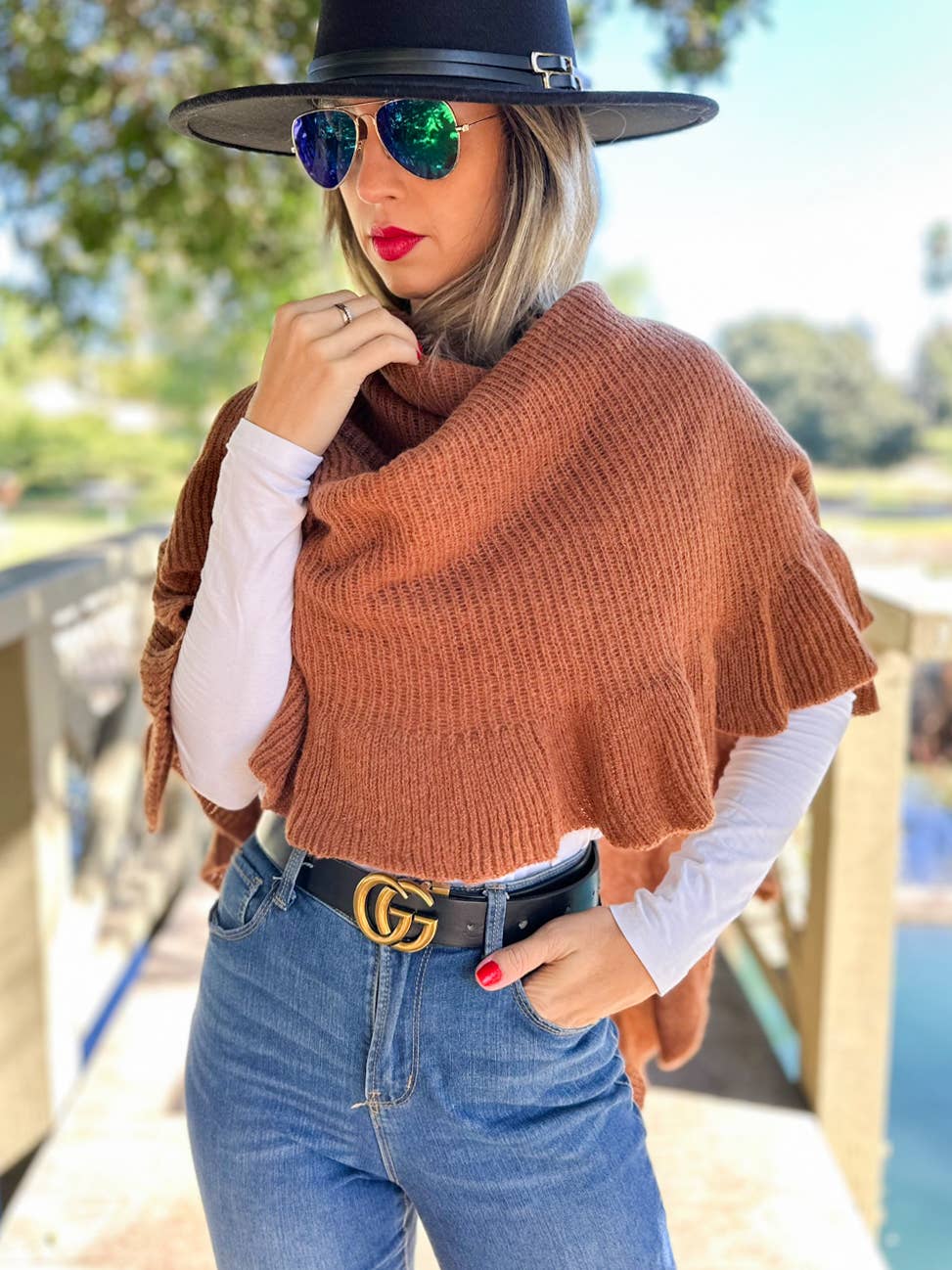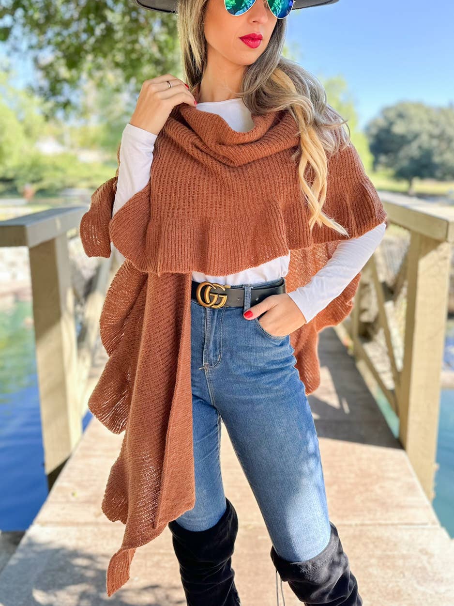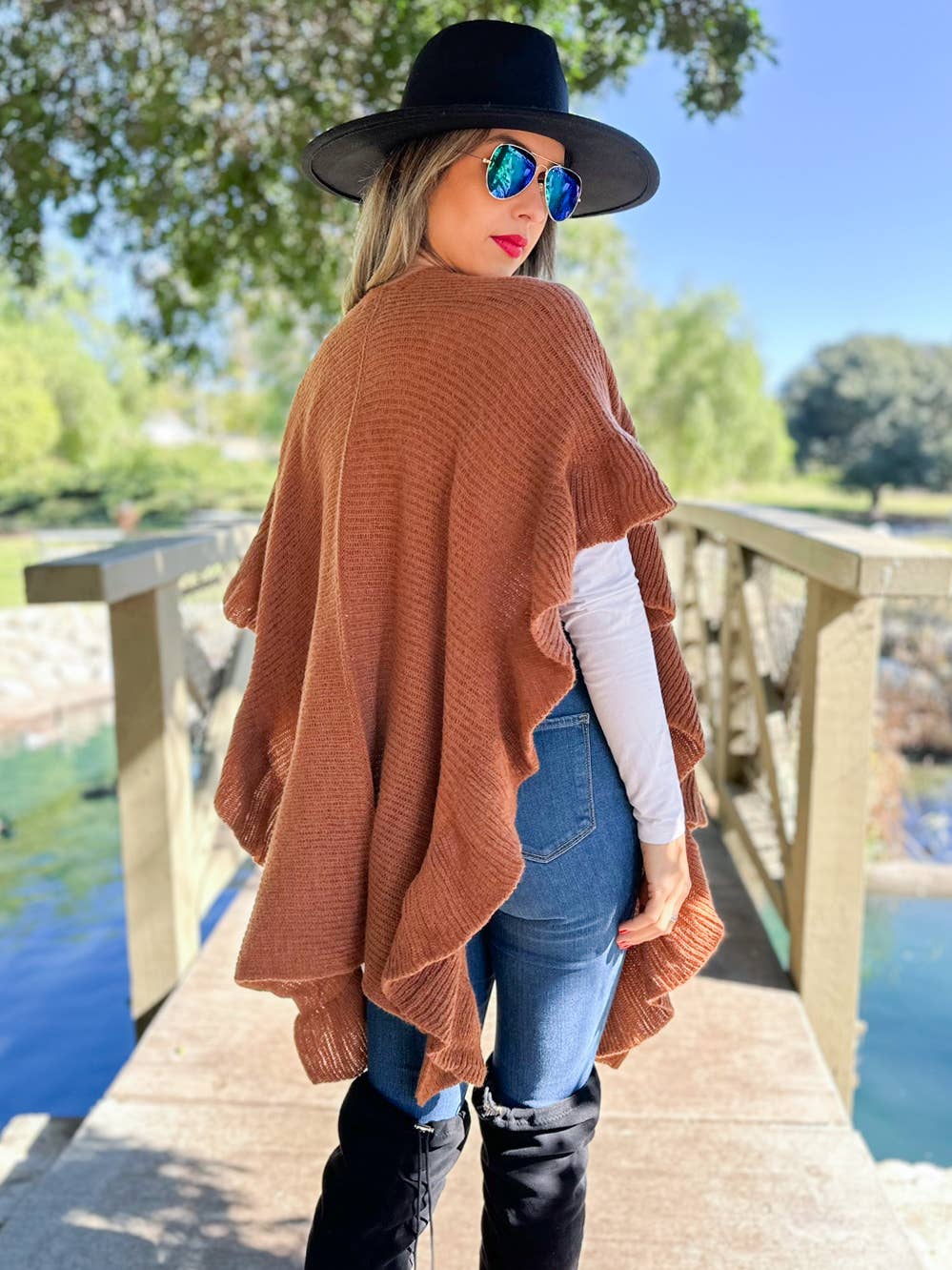 Wrap yourself in effortless elegance with this Soft Brown Ruana Shawl, featuring gentle ruffle detailing that adds feminine charm and graceful movement to any look.
