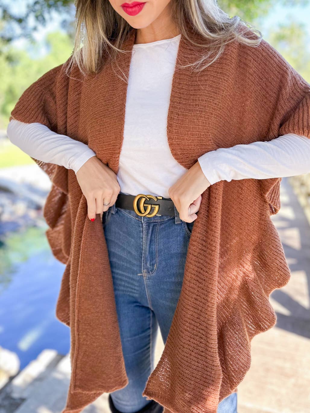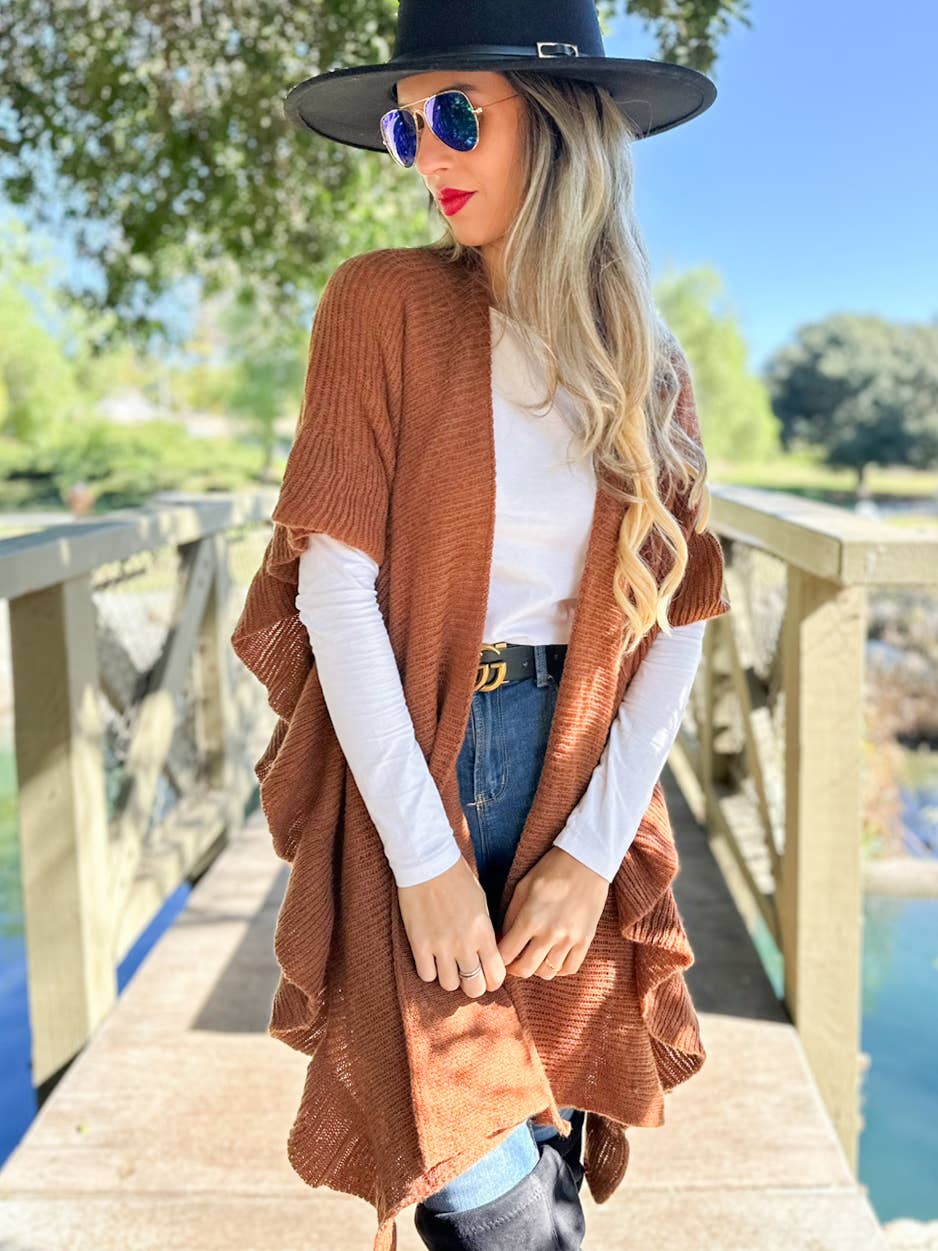 Soft Brown Ruffle Detail Open Front Lightweight Ruana Shawl