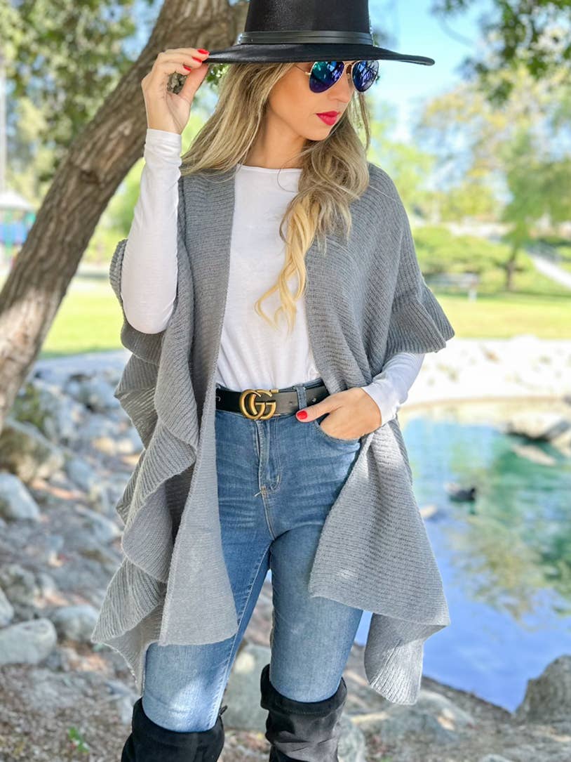 Wrap yourself in effortless elegance with this Soft Grey Ruana Shawl, featuring gentle ruffle detailing that adds feminine charm and graceful movement to any look.