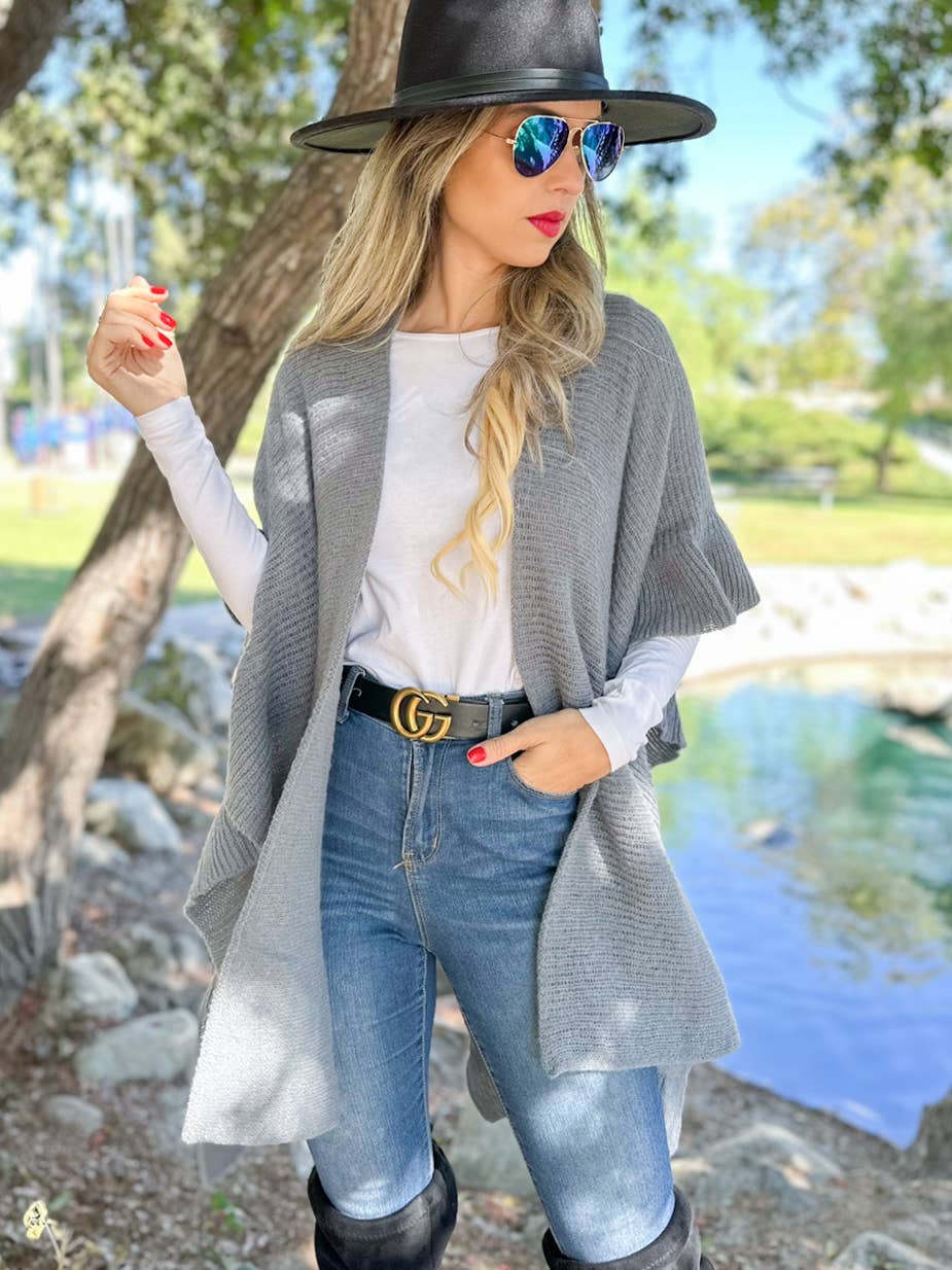 Soft Grey Ruffle Detail Open Front Lightweight Ruana Shawl